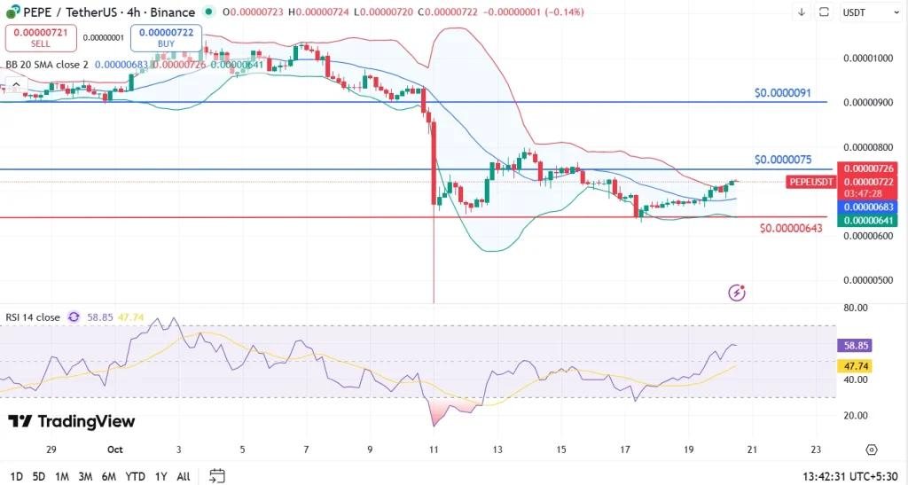 • RSI climbs to 58.85 as Pepe nears $0.0000075 resistance amid recovery channel.