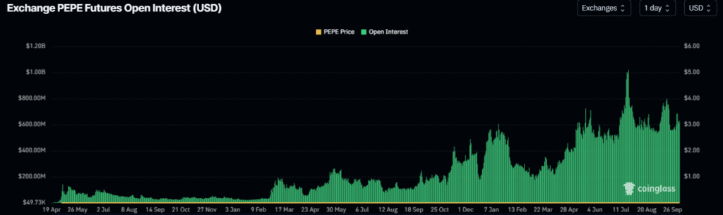 This surge in futures market activity highlights growing market speculation and confidence among traders. Open interest peaked at $1.2 billion in late July, signaling heightened attention and activity for $PEPE.