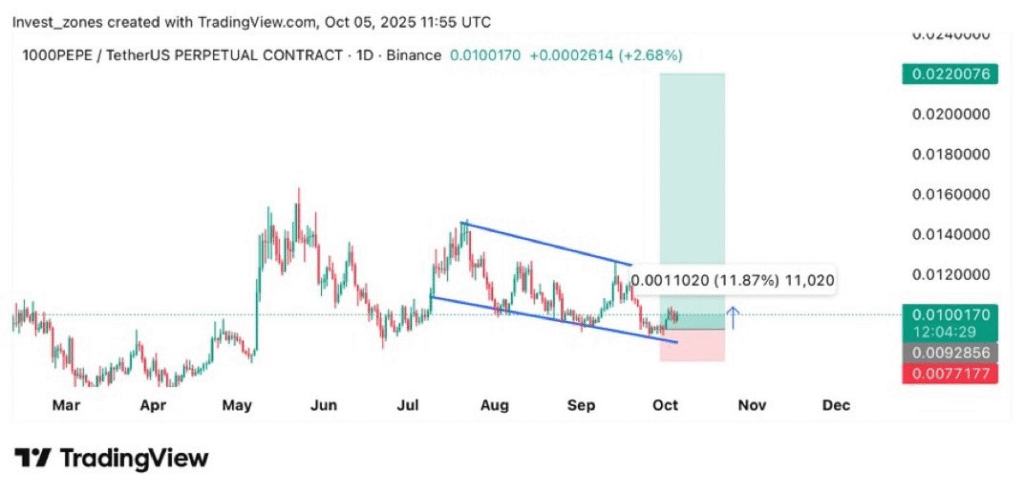 • A falling wedge pattern on $PEPE’s chart hints at bullish momentum ahead.