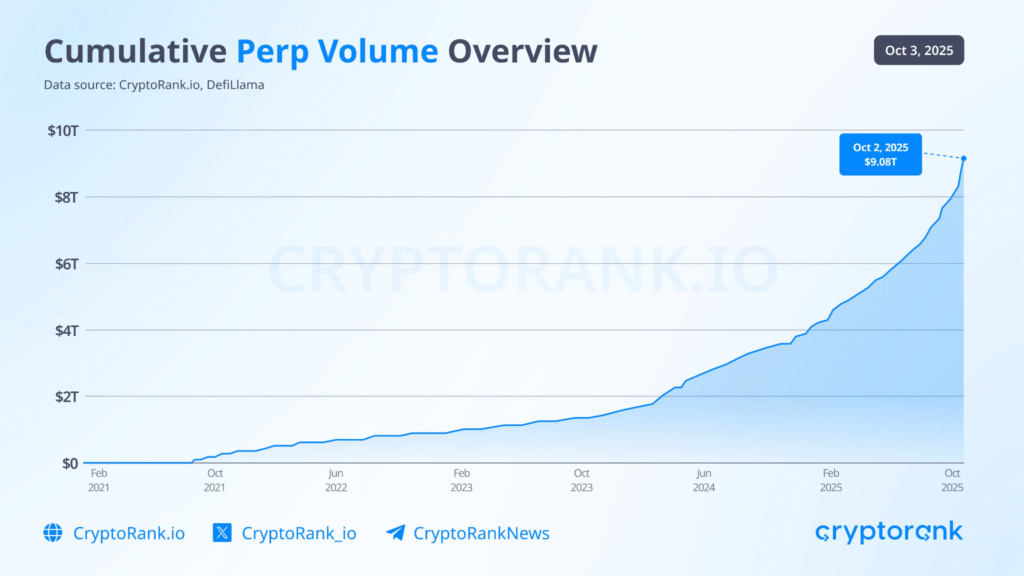 Perpetual trading volume across decentralized protocols has exceeded $9 trillion, according to data from CryptoRank.io and DeFiLlama. As of October 2, 2025, cumulative perp volume reached $9.08 trillion.Â
