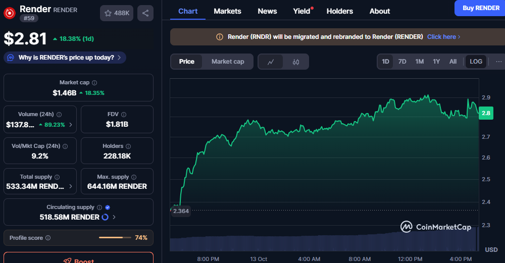 The token’s current momentum aligns with Render’s ongoing rebranding to RENDER. Such transitions often attract fresh attention and renewed market engagement. As trading remains active, Render sustains its advantage with consistent demand and bullish short-term energy.