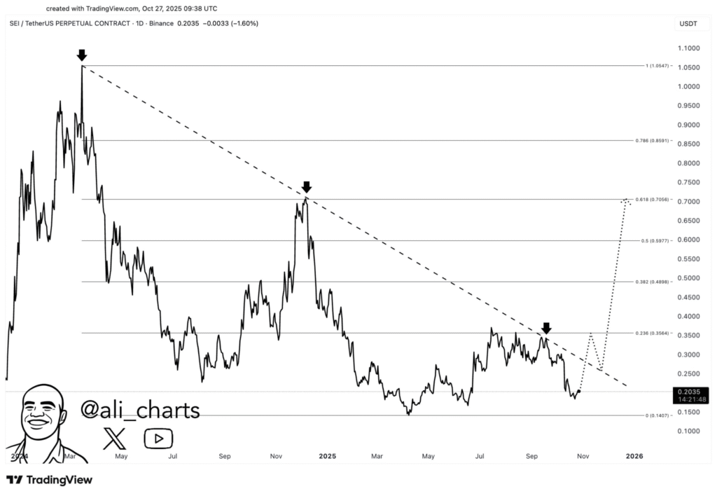 Ali cautioned that short-term pullbacks could occur as SEI retests the breakout trendline. He stated that maintaining higher lows above $0.20–$0.203 would support a recovery phase. “If this level holds, the reversal setup remains valid,” he said.