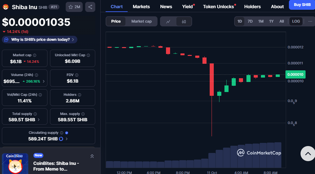 With a significant fall of more than 14 percent in the last 24 hours, Shiba Inu (SHIB) fell to $0.00001035. The correction is after an upward trend in the form of a smooth ride, which shows a short-term reversion in an active market cycle. The decline notwithstanding, trade is high, implying that players are still interested in trading SHIB as the currency is consolidated around a key support.