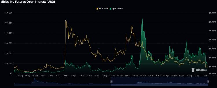 A recent decline in open interest and daily volume suggests SHIB may be near a potential bottom. Open interest, which tracks the number of active contracts, has dropped below $80 million. This level was last seen in January 2025, just before SHIB experienced a sharp rise in price.