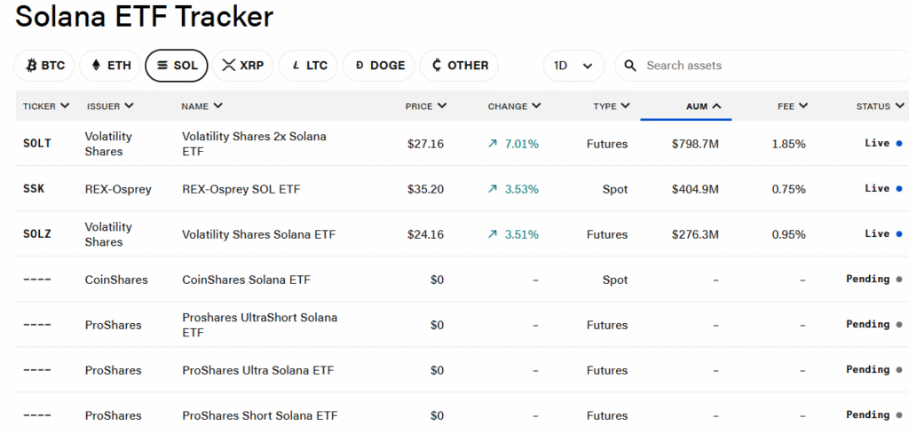 Volatility Shares and REX-Osprey lead the live Solana ETF segment, offering both futures and spot exposure. The Volatility Shares 2x Solana ETF (SOLT) remains the largest, trading near $27.16 with an AUM of $798.7 million. Similarly, the REX-Osprey SOL ETF (SSK) holds $404.9 million, while the Volatility Shares Solana ETF (SOLZ) manages $276.3 million.