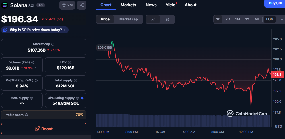 The technical indicators indicate that the overall uptrend has not been upset by short-term weakness. The $190-195 price is now serving as a key pivot point, consistent with the short-term moving averages. If Solana controls this zone, there may be a rebound to a range of 210 to 215, resuming an upward trend.