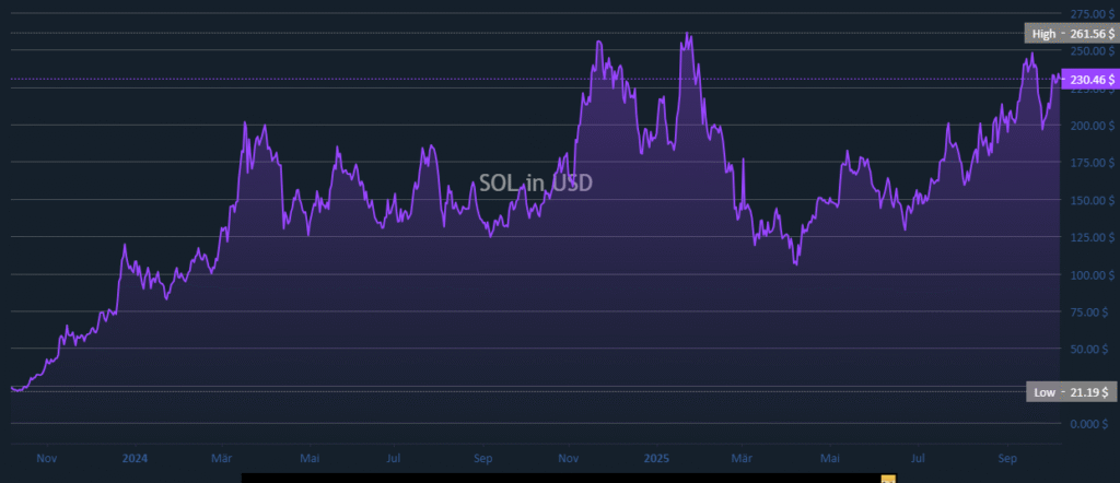 From late 2023 through 2025, Solana’s price experienced sharp swings yet maintained a long-term upward bias. The coin rose from near $20 to a peak of $261.56 before undergoing a major correction. Despite the volatility, its structure shows resilience and steady accumulation over time.