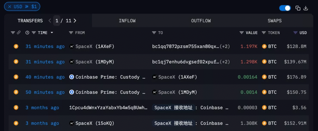 The previous transfer from SpaceX occurred in July 2025, when the company moved 1,308 BTC, worth around $153 million, to a Coinbase Prime Custody wallet after three years of inactivity. Analysts believe the current transaction follows the same pattern, indicating internal fund management rather than an offload.