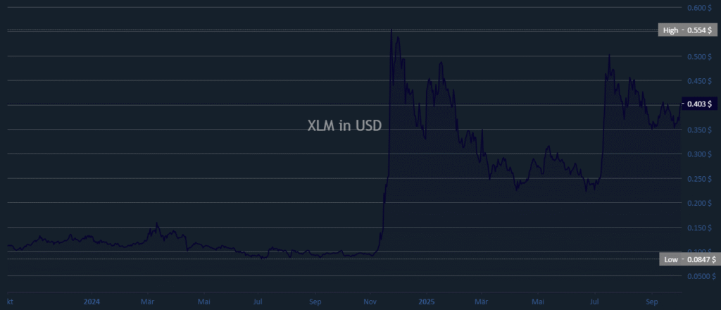 XLM displayed a major structural shift in late 2024, rallying from below $0.10 to a high of $0.554. The sharp move reflected market catalysts, technical breakouts, and broader momentum across digital assets. This surge marked one of the strongest upward impulses in recent history for the token.
