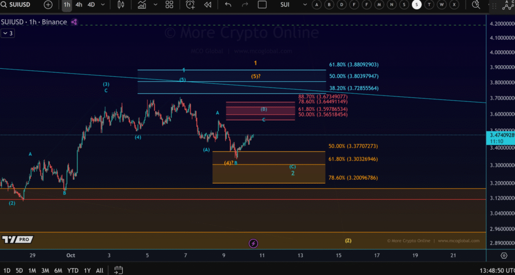 At the time of analysis, SUI was trading near $3.47 on Binance. The Fibonacci retracement zones indicate that the 50% to 78.6% levels correspond to the current support area. These levels have historically served as strong zones where prices often stabilize before resuming the main trend direction.