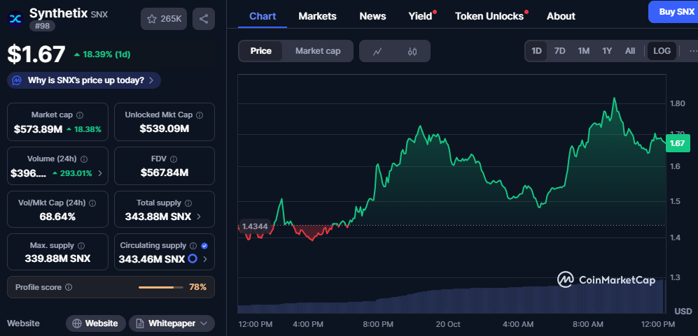Synthetix (SNX) saw a steep rise in price, and it increased 18.39 percent during the last 24 hours to trade at $1.67. The token rose all through the day, starting at 1.43, and reaching a high of about 1.80. This steady increasing trend indicates a resurgence of SNX on the DeFi market.