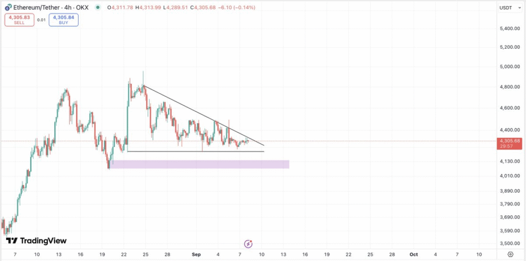 Ethereum is currently experiencing consolidation, as indicated by its technical chart patterns. The 4-hour chart shows a descending triangle, with price movements testing key support levels near $4,290–$4,300.