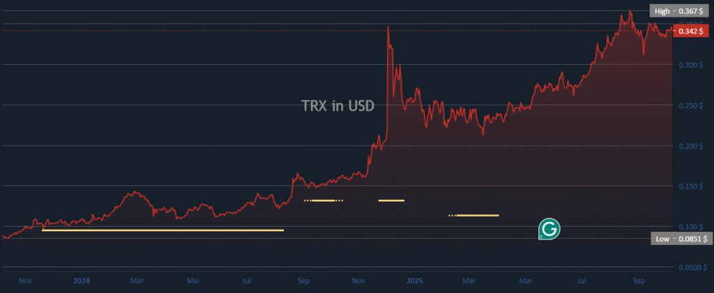 The native token of TRON, TRX, is highly appreciating in the long term and has market support all the way through 2024 to 2025. The asset has risen as low as $0.0815 up to a high of 0.367, indicating its strength. Although there have been temporary corrections, the chart shows a positive upward trend that has been fuelled by strong fundamentals and network expansion.