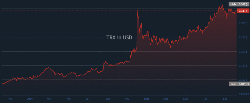 - With consistent higher lows and improving technicals, TRX could break above $0.37 if buying pressure strengthens in late 2025.