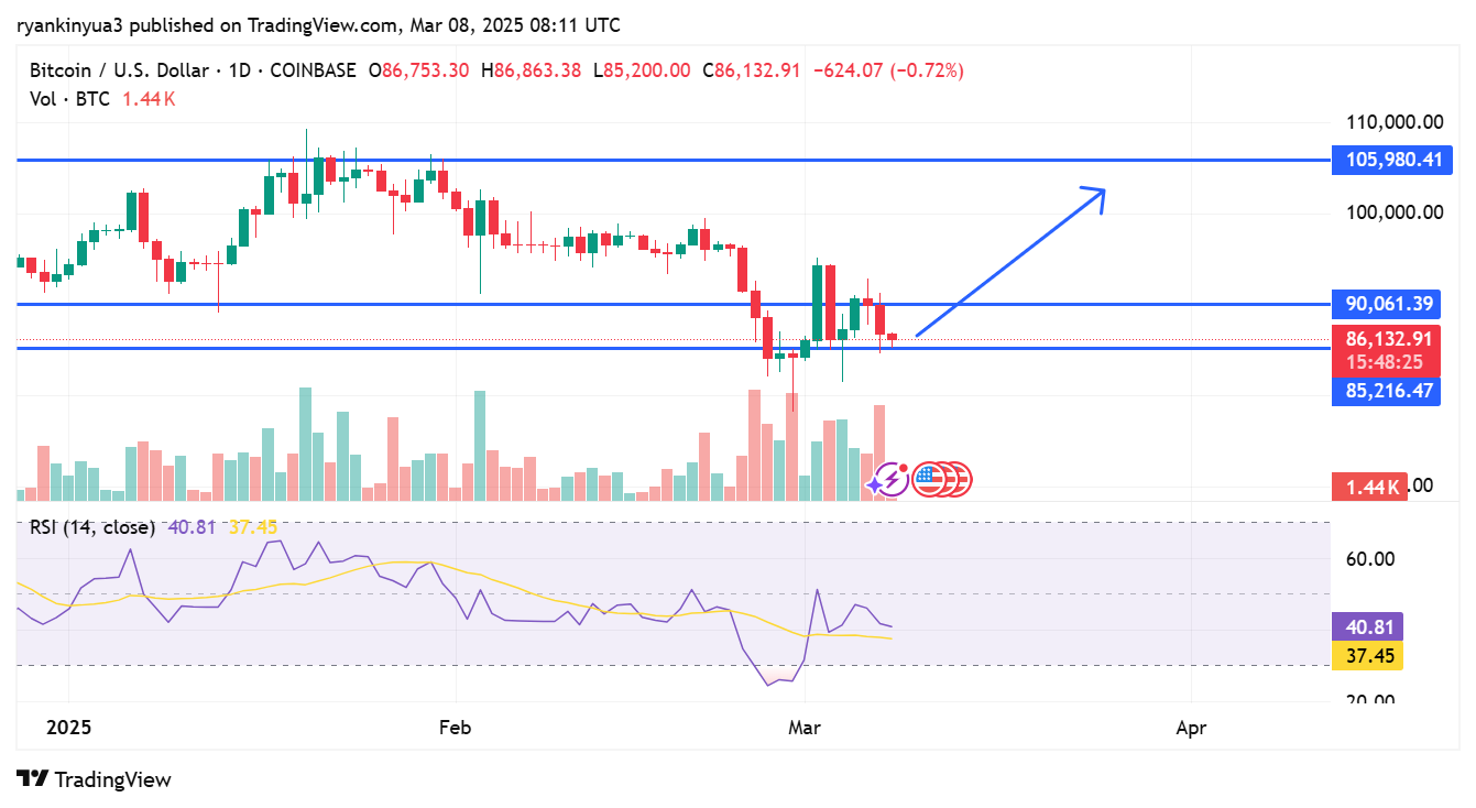 Bitcoin’s price movement reflects ongoing market uncertainty, as seen in the latest trading data. A recent analysis of Bitcoin’s chart shows that cryptocurrency trading is at $86,132.91, down 0.56% for the day. The price remains below key resistance levels, with $89,180.12 as a short-term ceiling, while significant support lies at $85,216.47. The Relative Strength Index (RSI) stands at 40.81, suggesting weak momentum and a possible continuation of the downtrend if buying pressure does not increase.