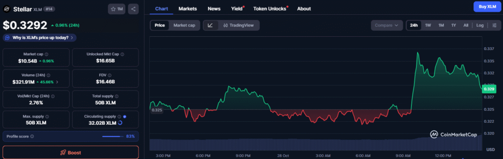At the time of writing, Stellar (XLM) trades at $0.3292, marking a 0.96% increase in the past 24 hours. The token maintains key support between $0.32 and $0.35, showing resilience amid higher trading activity.