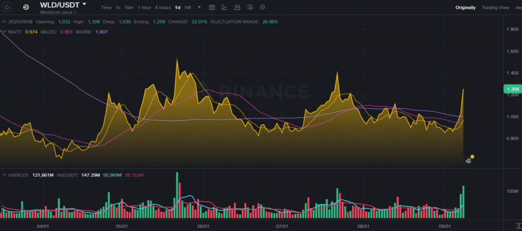 The token is now priced at $1.258, reflecting a strong daily gain. The move also covered nearly 27% in fluctuation range. These numbers highlight the volatility but also growing strength in Worldcoin (WLD).
