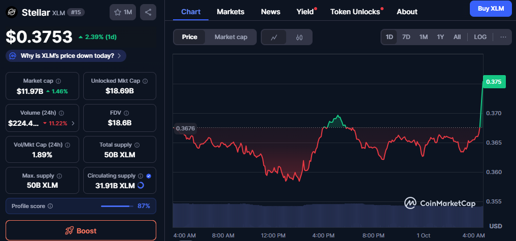 On September 29, 2025, renowned crypto analyst Ali Martinez provided an update on Stellar ($XLM). According to his analysis, XLM has been testing the $0.38 resistance level in recent trading sessions.