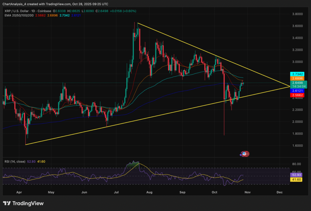 The market’s focus is now on the $2.40 level, which represents a critical support zone for XRP. If the price fails to hold this level, a deeper retracement toward $2.10 is likely, undoing the gains made earlier in October. The outlook remains uncertain, with both technical and on-chain indicators signaling possible downward movement.