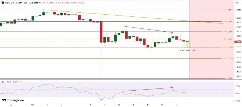 Recent trading patterns suggest that XRP is moving within a descending triangle. This pattern, combined with bearish RSI divergence, indicates a potential further drop. Some analysts suggest a possible fall to the $2.08–$1.77 range. If XRP manages to break above $2.82, it may target the $3.10 level in the short term.