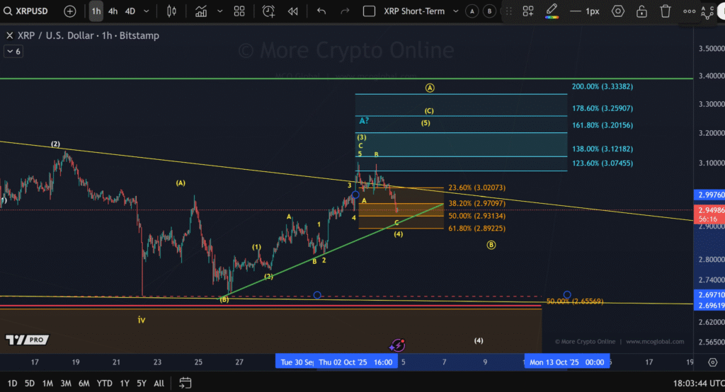 The ongoing retracement has exhibited a zigzag pattern a common corrective structure, as the price attempts to regain stability. Key Fibonacci retracement levels are also in play, with the 38.2% level around $2.97 standing as a potential support zone.