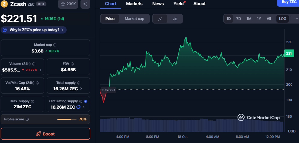 Zcash (ZEC) recorded a strong market rebound, rising 16.16% in the past 24 hours to trade at $221.51. The digital asset’s sharp rise places it among the day’s top-performing privacy-focused cryptocurrencies. Its market capitalization expanded to $3.6 billion, showing renewed momentum across the privacy sector.